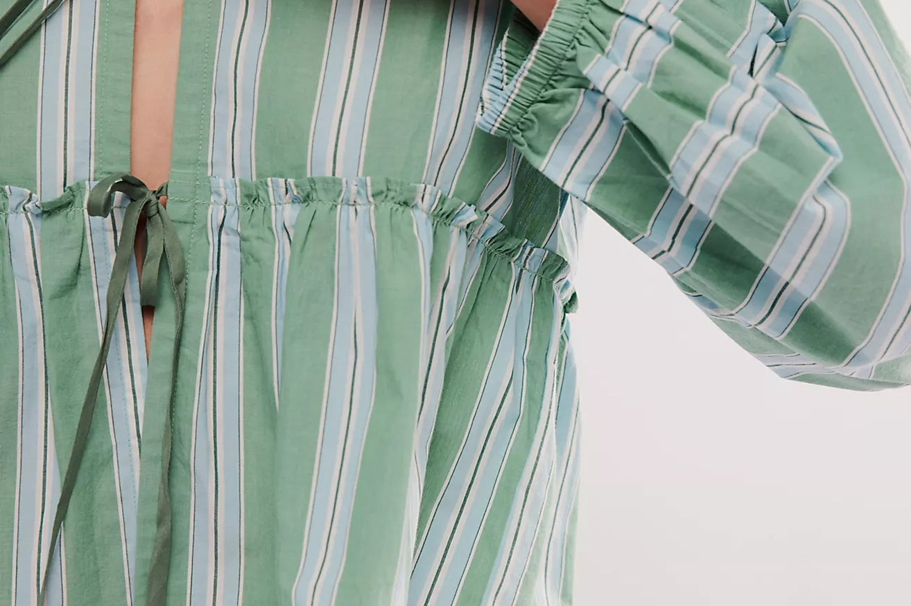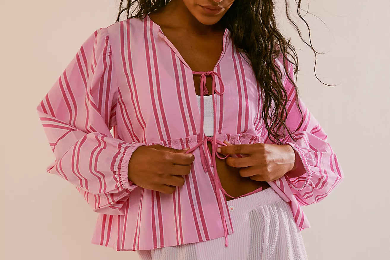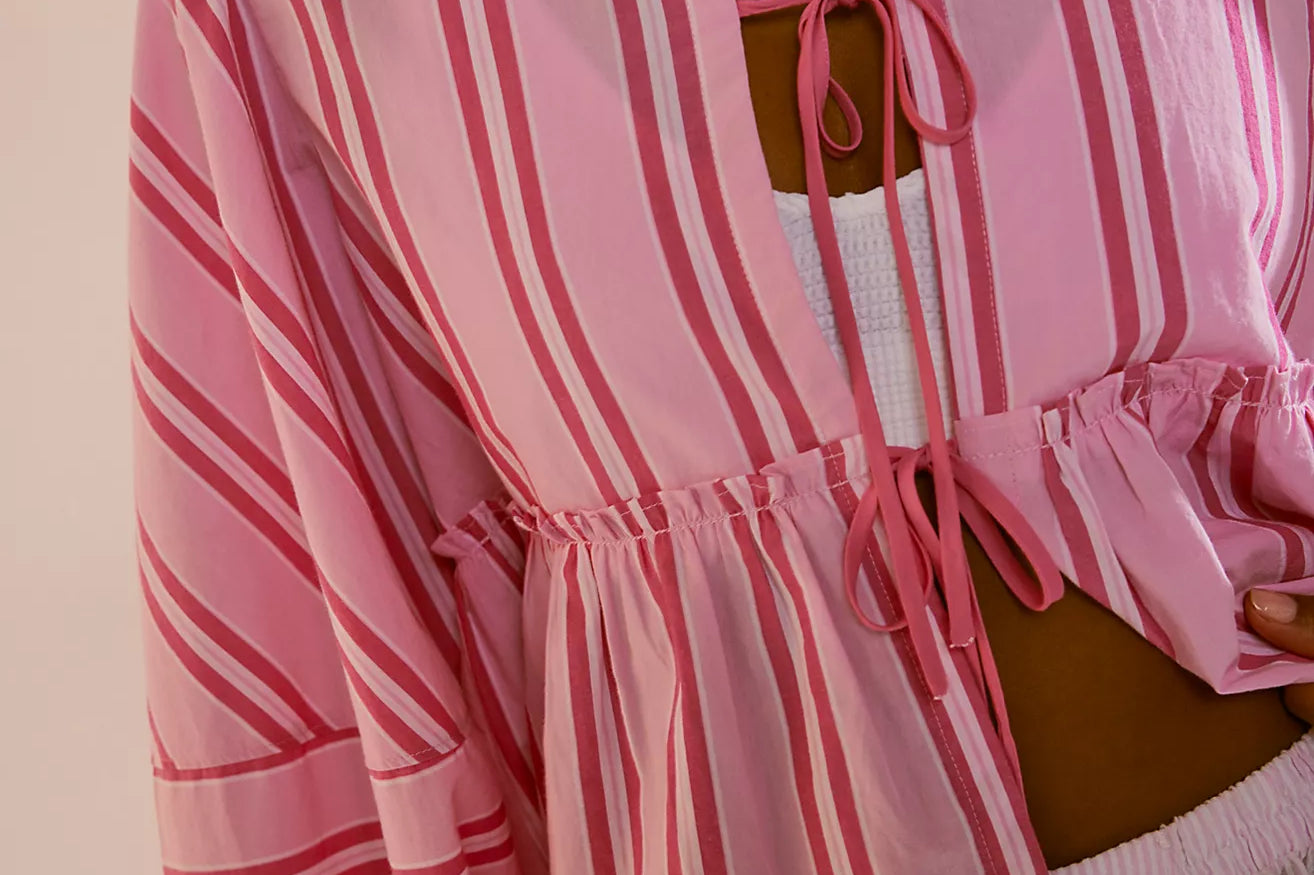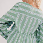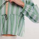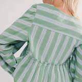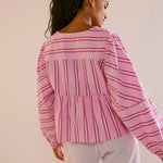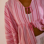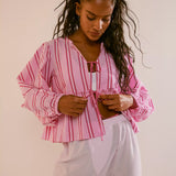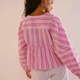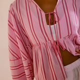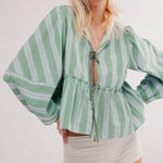 La blusa a rayas Ava presenta un diseño atemporal con un toque moderno, resaltado por un elegante detalle de cordones en la parte delantera. Las rayas versátiles añaden un toque de clase, mientras que el frente con cordones añade un elemento de intriga y atractivo.