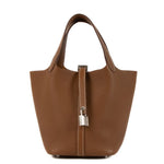 Este bolso elegante y versátil eleva tu estilo sin esfuerzo. El diseño clásico y profundo del cubo presenta un asa doble más alta y ancha, lo que lo hace perfecto para llevarlo en la mano o en el brazo. La sensación de lujo se ve realzada por un sencillo cierre de metal y elegantes herrajes plateados.