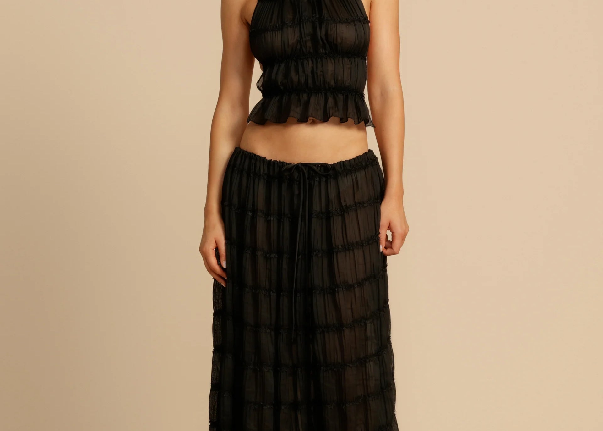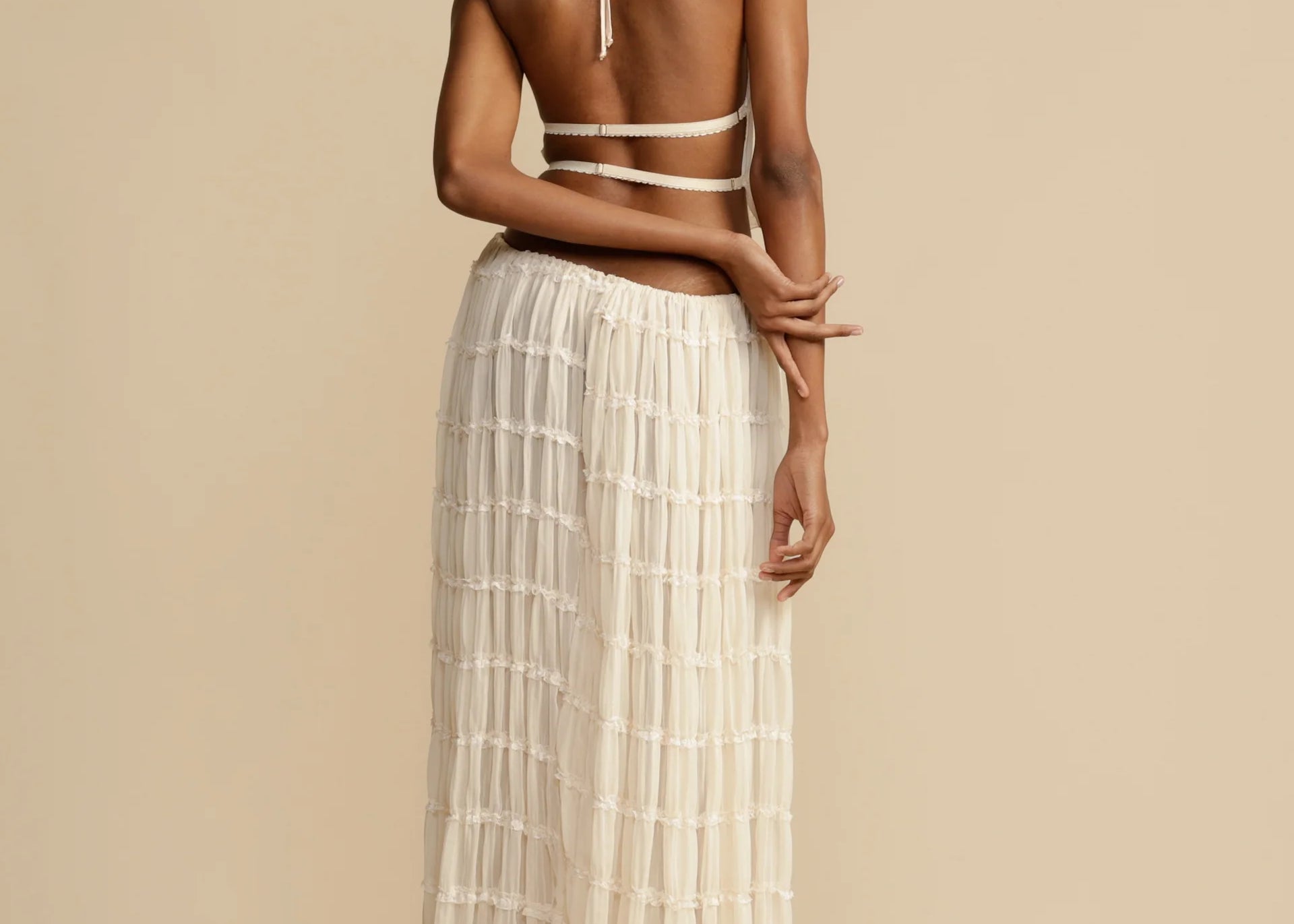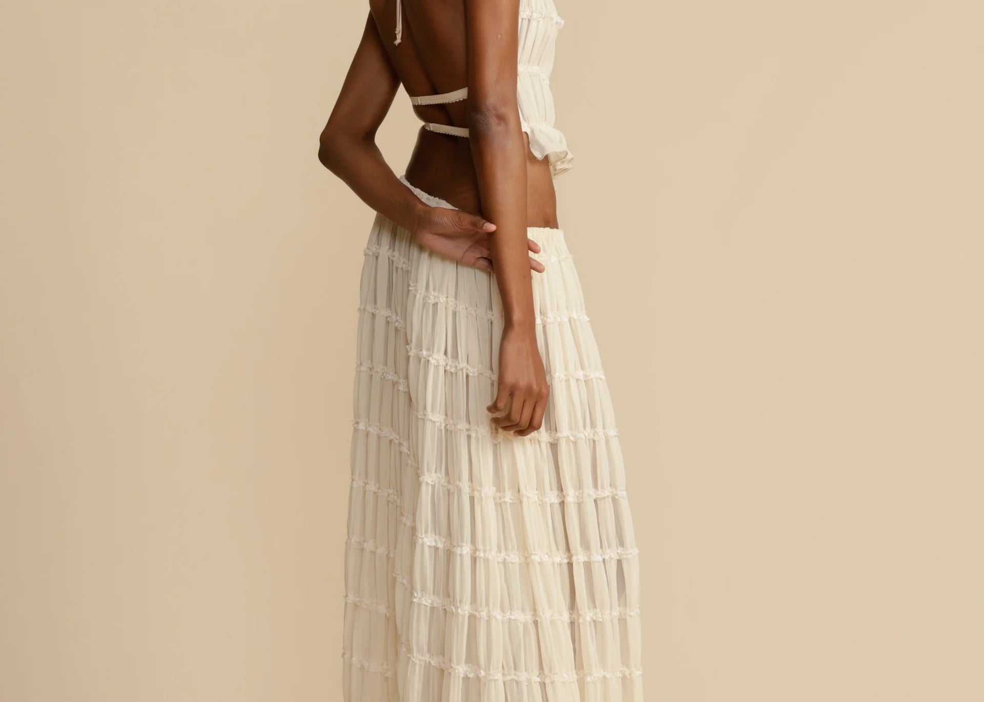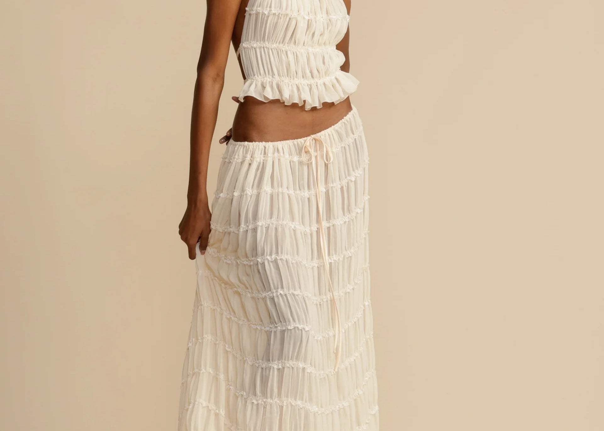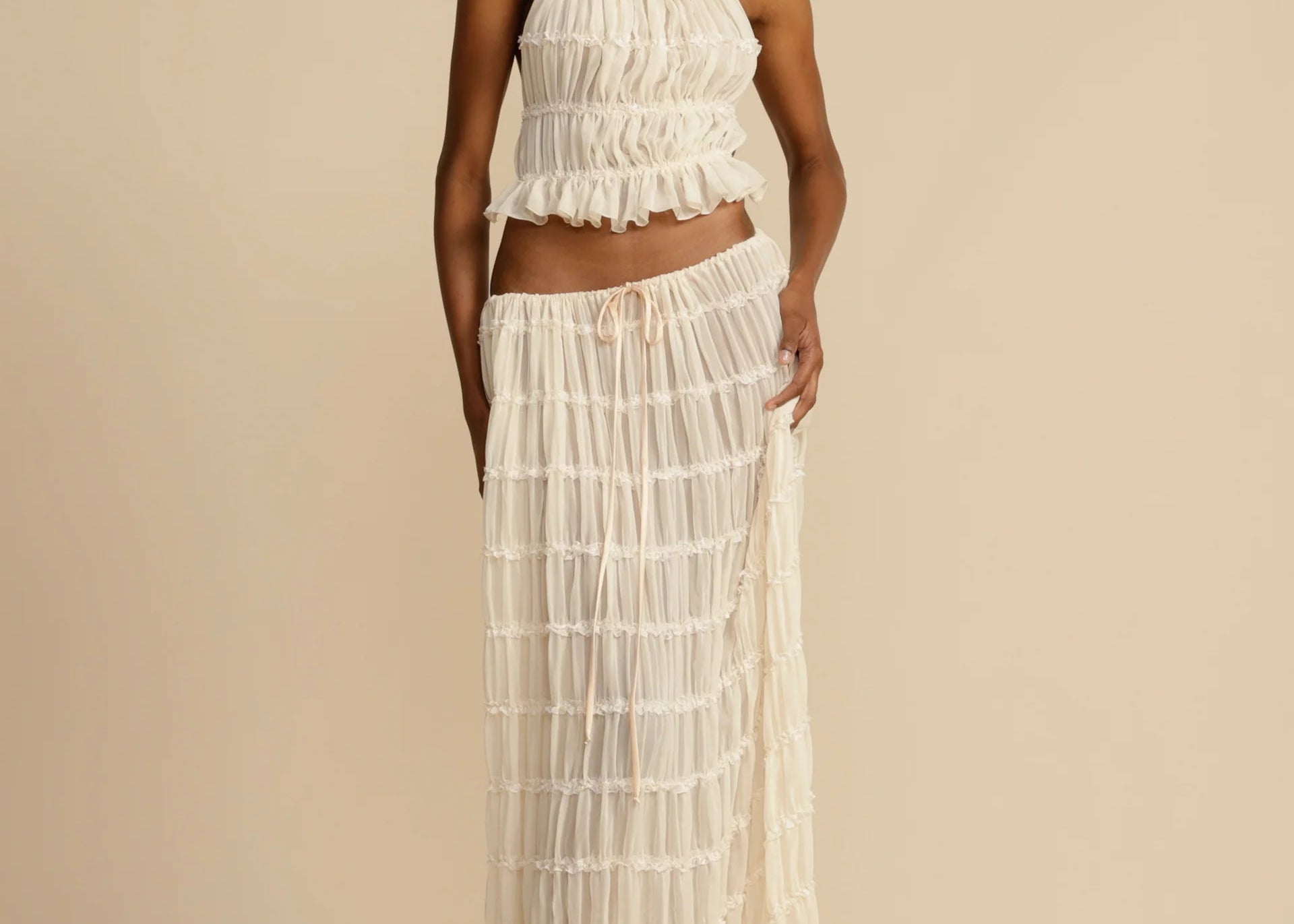 Presentamos el conjunto romántico con volantes Georgina, una blusa de inspiración vintage con detalles fruncidos y delicados bordes de encaje. Confeccionado en un lujoso tono crema cálido, irradia romance y atemporalidad. Diseñado para la versatilidad, un lazo ajustable se asegura en el cuello, mientras que las tiras elásticas de satén ajustan la cintura.