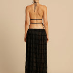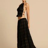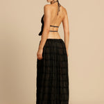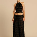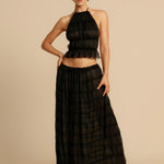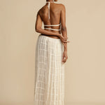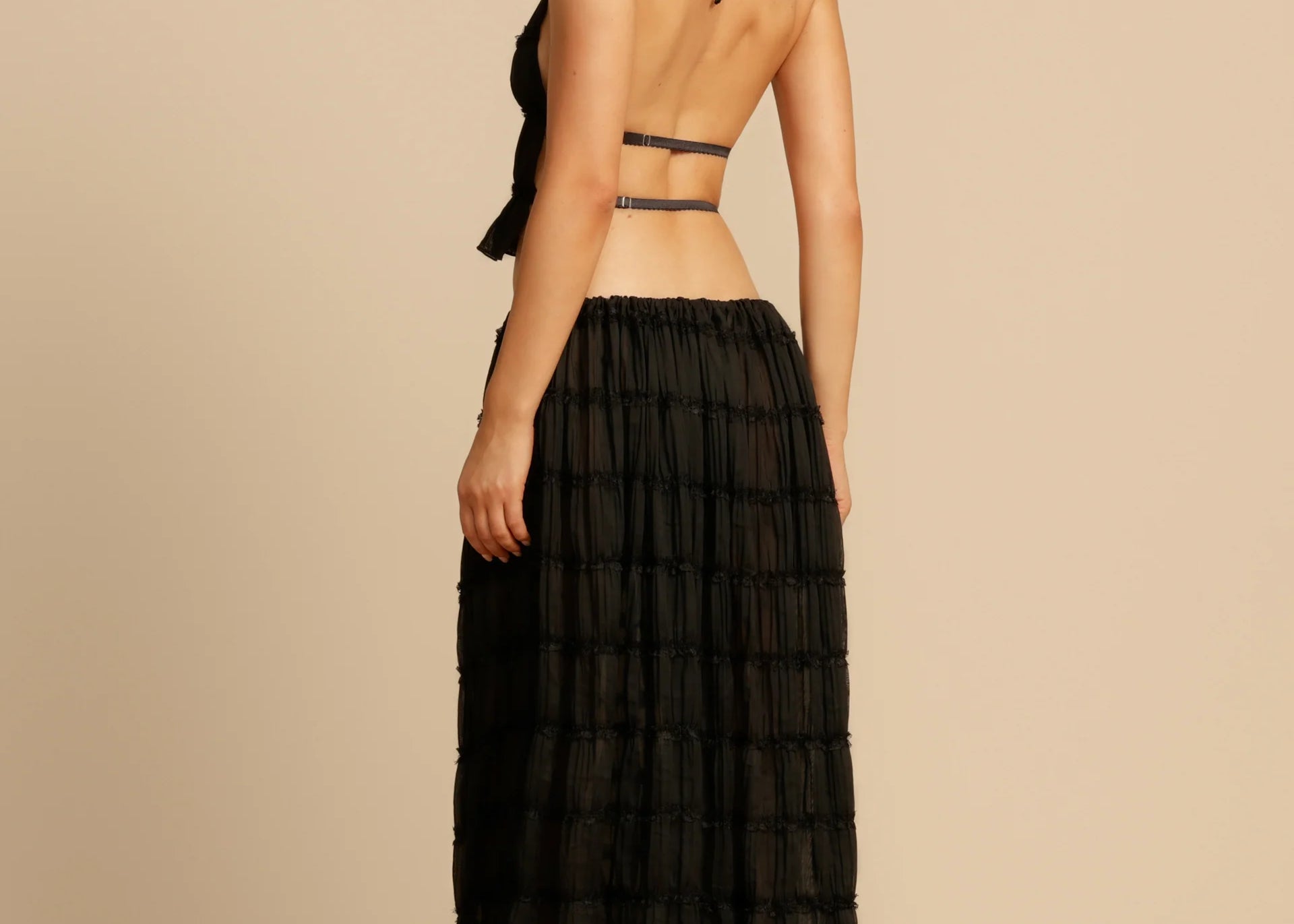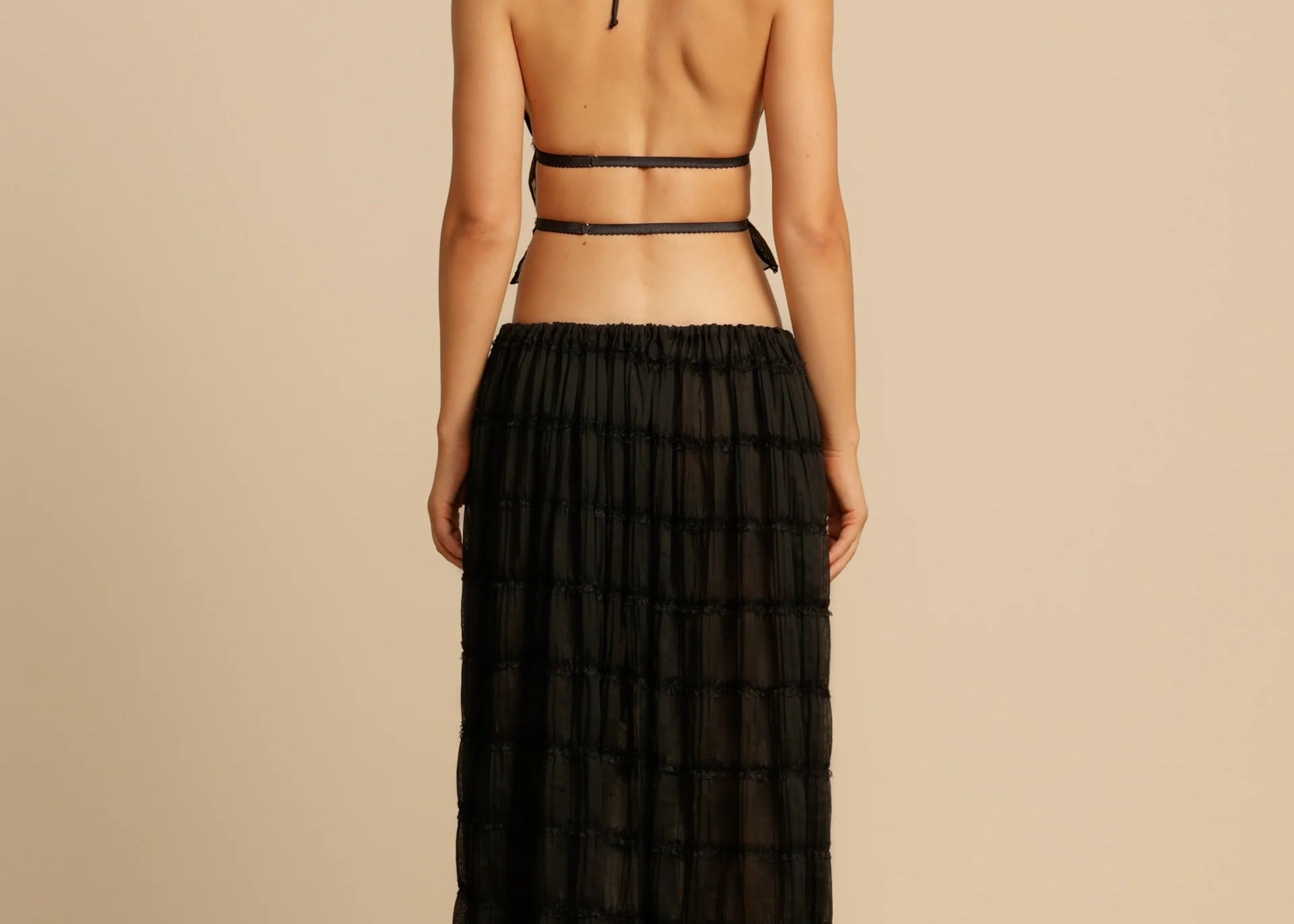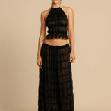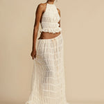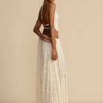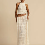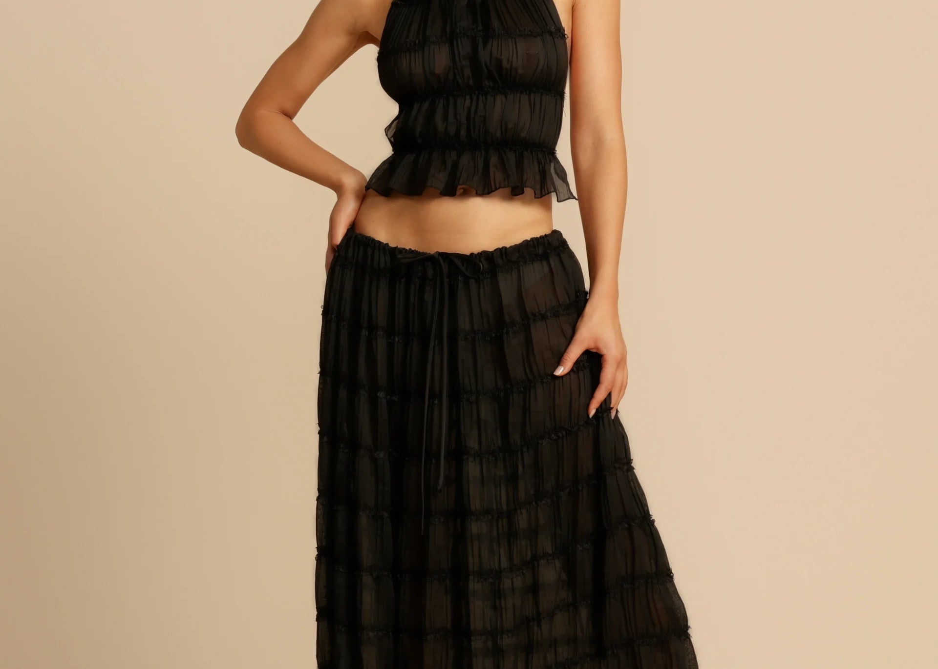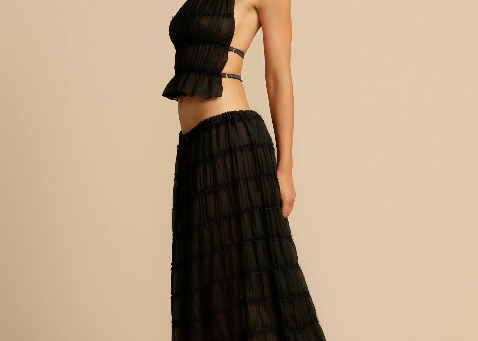 Presentamos el conjunto romántico con volantes Georgina, una blusa de inspiración vintage con detalles fruncidos y delicados bordes de encaje. Confeccionado en un lujoso tono crema cálido, irradia romance y atemporalidad. Diseñado para la versatilidad, un lazo ajustable se asegura en el cuello, mientras que las tiras elásticas de satén ajustan la cintura.