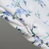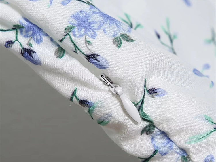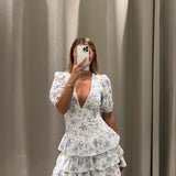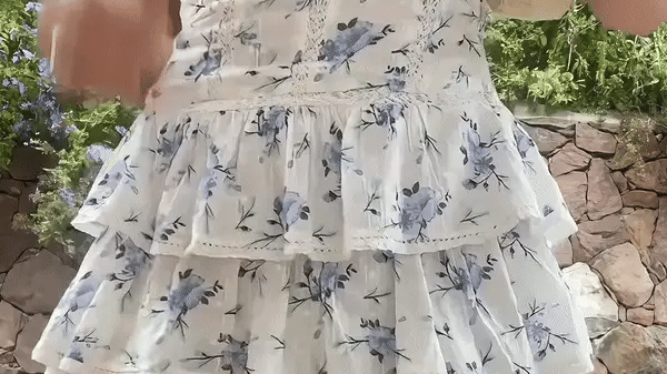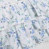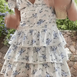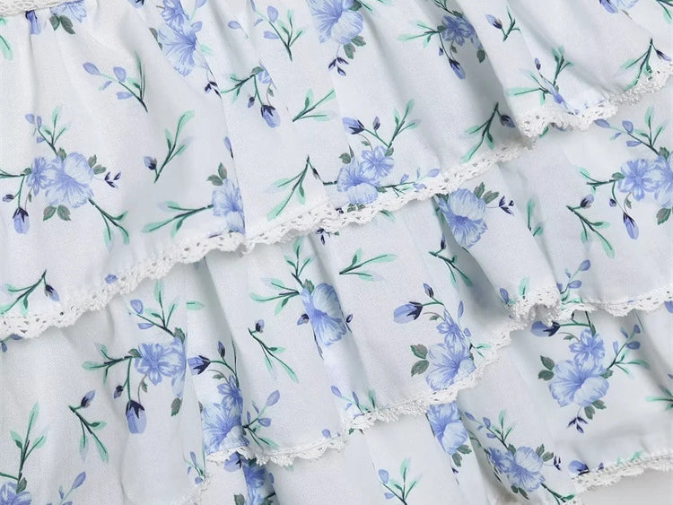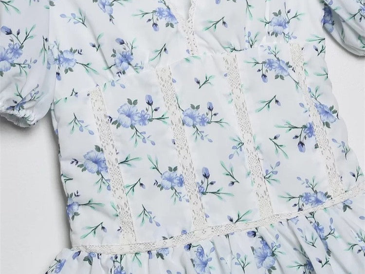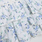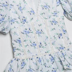 The Grace floral mini dress will make your significant other's heart flutter! This woven mini dress is girly and playful, adorned with a charming blue, white, and green floral print, a plunging neckline, a fitted bodice, and cute puffy sleeves. The waist is cinched with delicate lace detailing, while multiple tiers of ruffles add a flirty touch to the short flared skirt. Secretly fasten the dress with a zipper on the side.