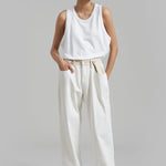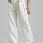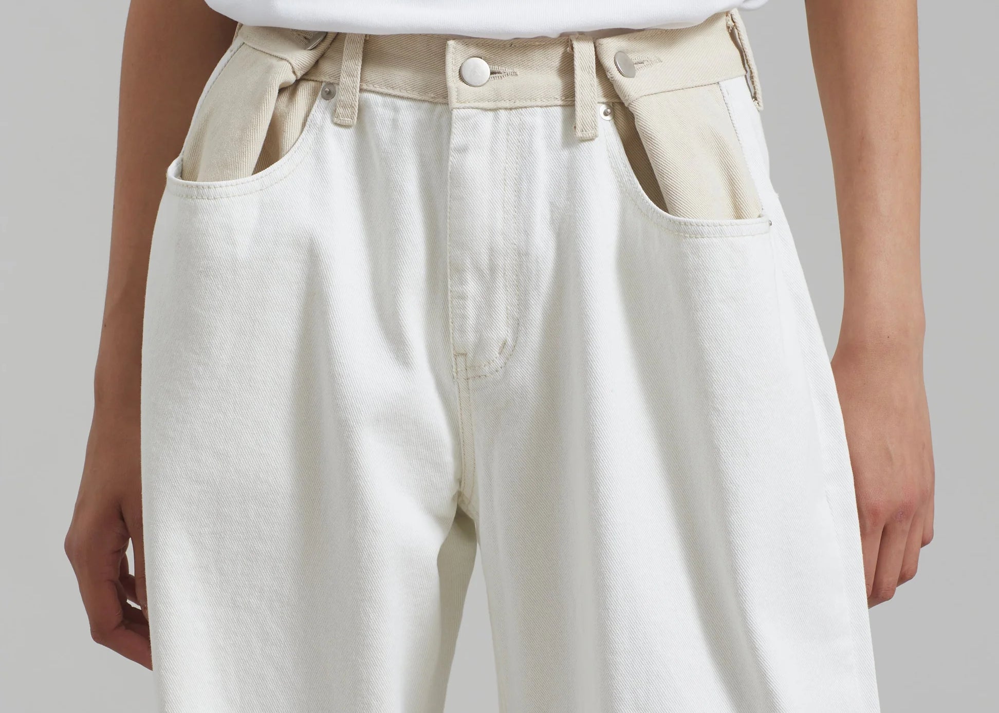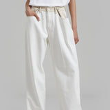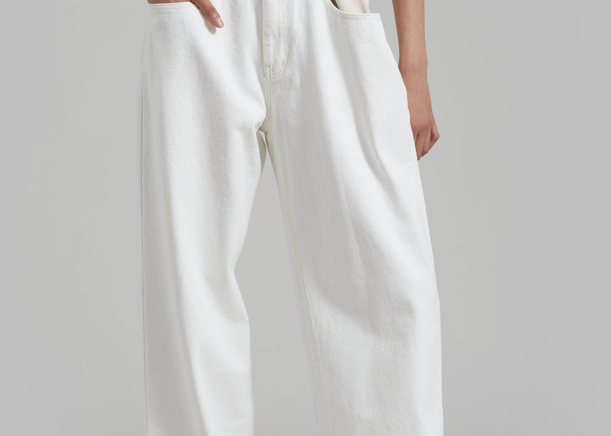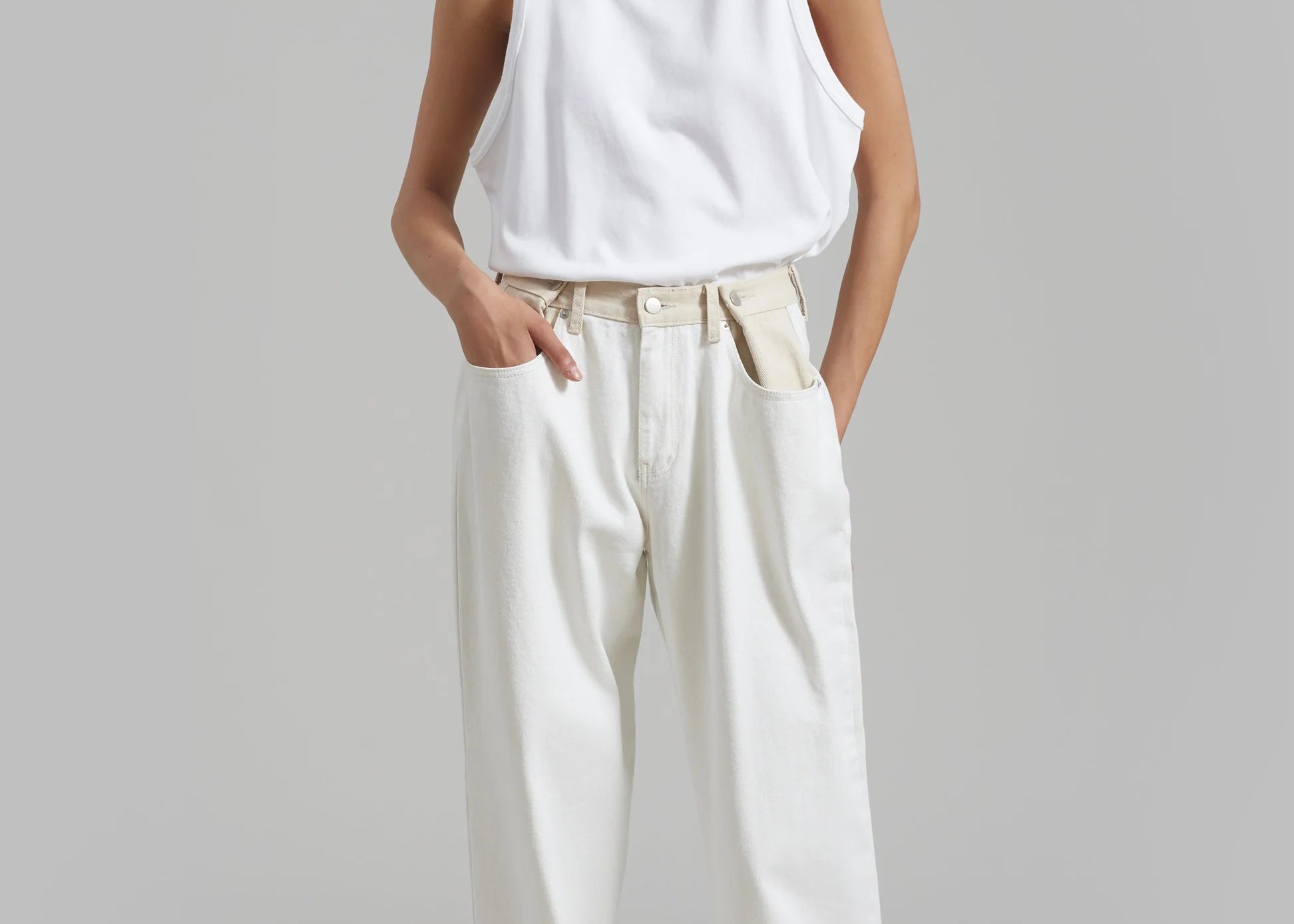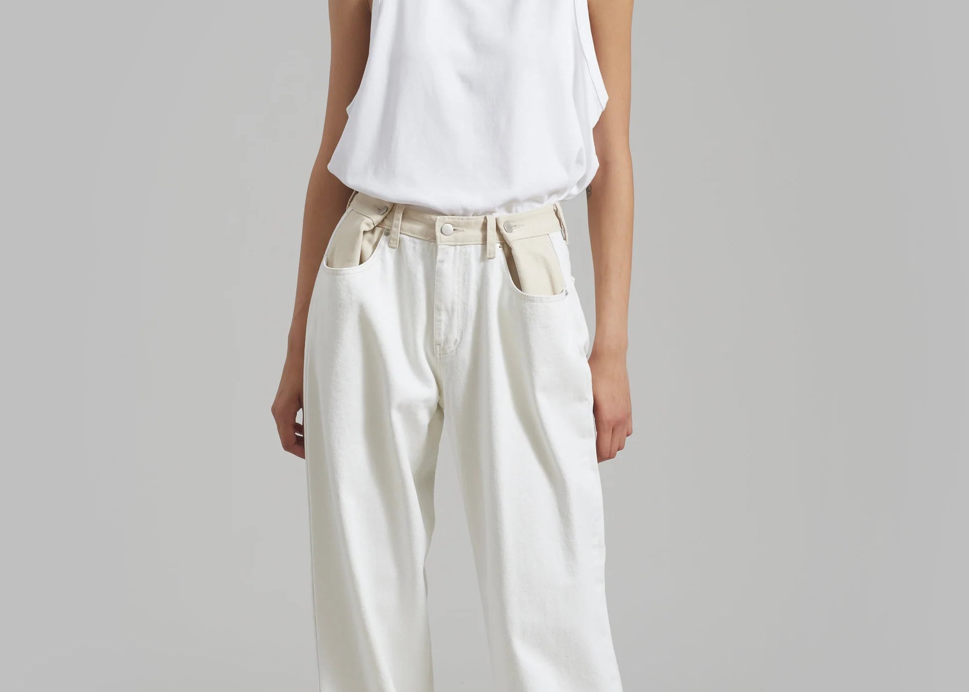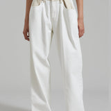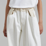 Un giro audaz sobre una silueta clásica; los Jeans Marlee Contrast Barrel redefinen el estilo casual y fresco. Diseñados con una forma estructurada de pierna tipo barril y una cintura de contraste única, destacan con líneas limpias y detalles inesperados. El lavado blanco roto añade un aspecto minimalista y fresco, mientras que la ausencia de bolsillos traseros crea un acabado elegante y moderno.