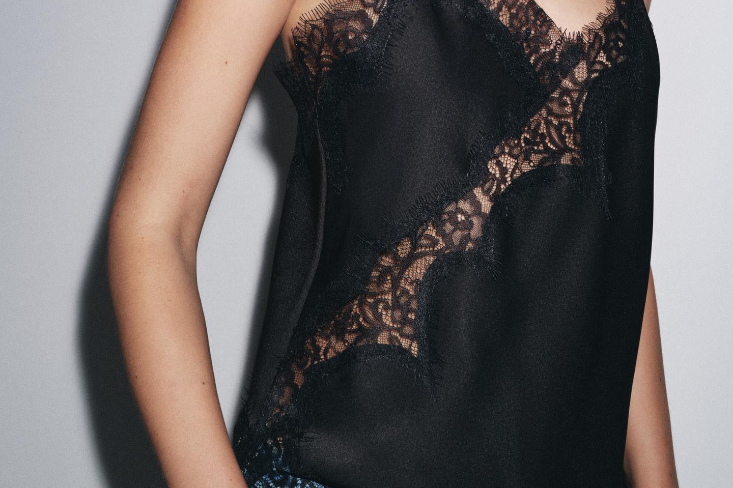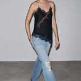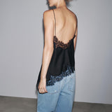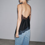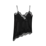 Le haut asymétrique Elise Lace offre un mélange d'élégance et de style audacieux. Confectionné dans un tissu soyeux et lisse, ce caraco présente des panneaux en dentelle transparente disposés selon un motif asymétrique distinctif. La bordure en dentelle délicate le long de l'encolure et de l'ourlet ajoute une touche douce et romantique, tandis que les fines bretelles spaghetti offrent une silhouette élégante et tendance.