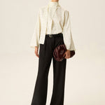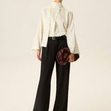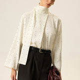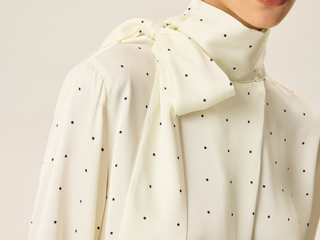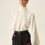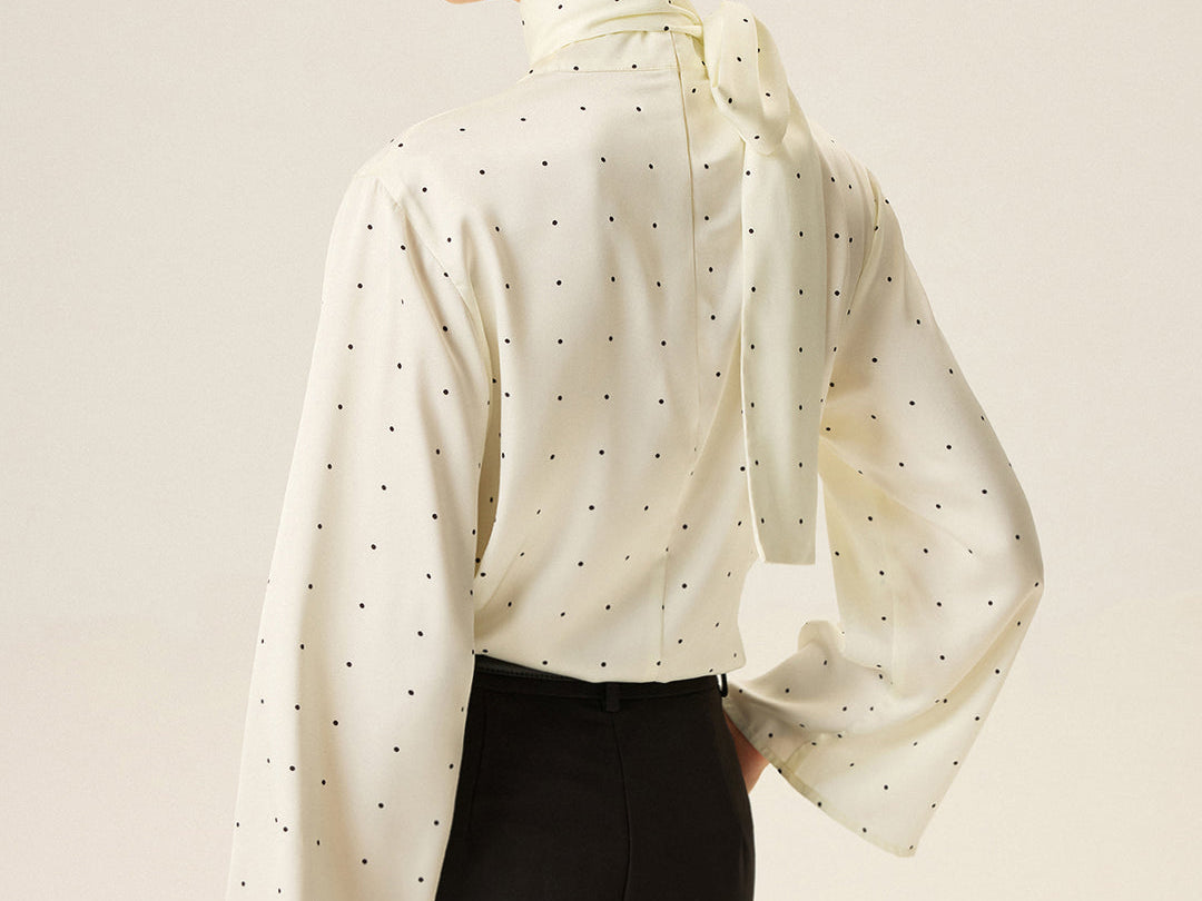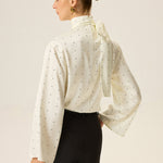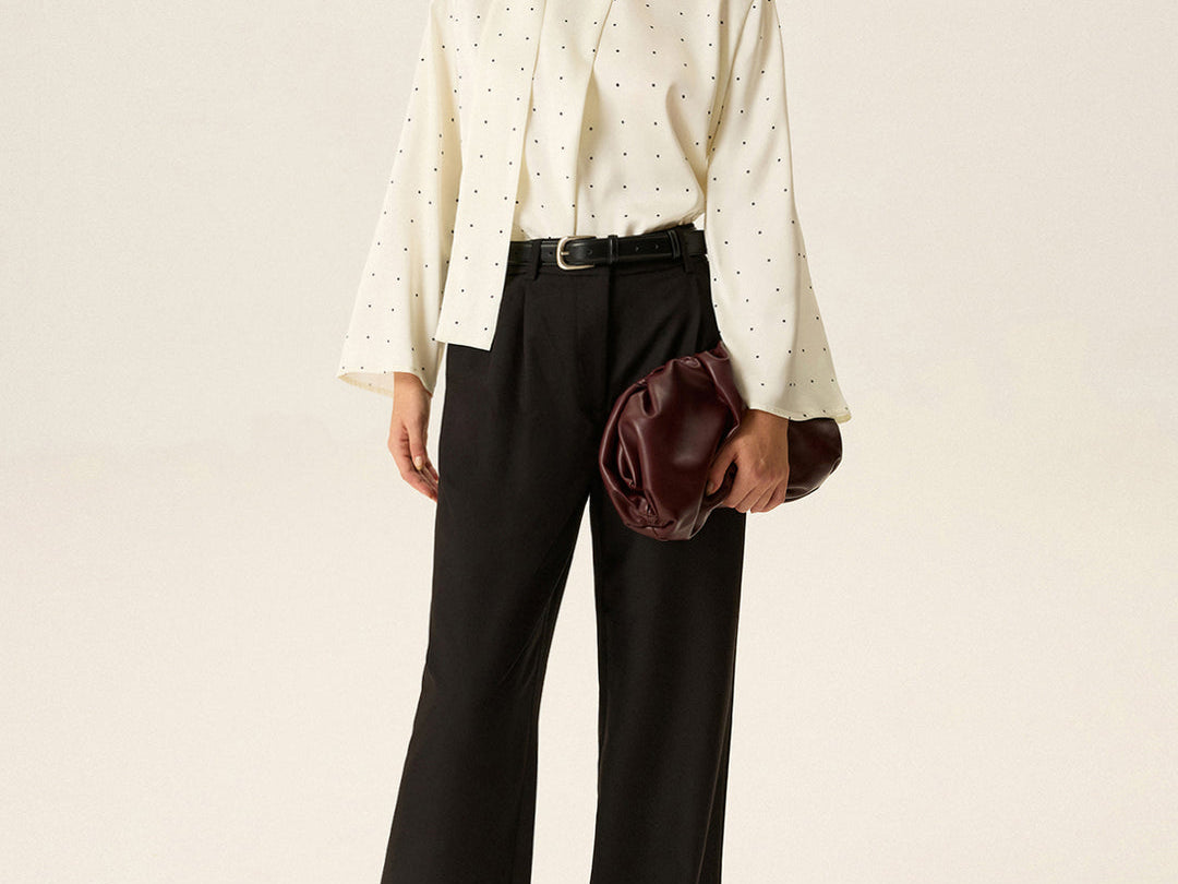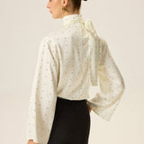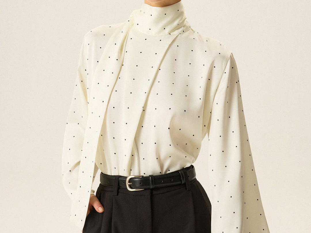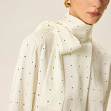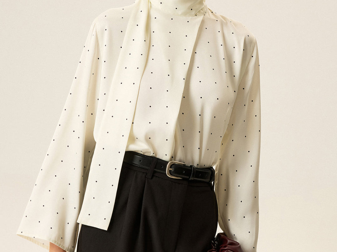 Le Blouse Eileen à pois est un modèle élégant à col montant, confectionné dans un tissu doux et fluide qui tombe magnifiquement. Son motif à pois subtil ajoute une touche intemporelle et raffinée, le rendant parfait aussi bien pour le bureau que pour les occasions en soirée. Les manches amples offrent une liberté de mouvement, tandis que le détail du long nœud au col propose des options de style polyvalentes. Rentrez-le dans un pantalon tailleur ou portez-le librement, ce chemisier rehausse toute garde-robe minimaliste avec une sophistication discrète.