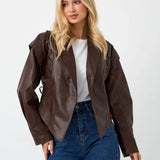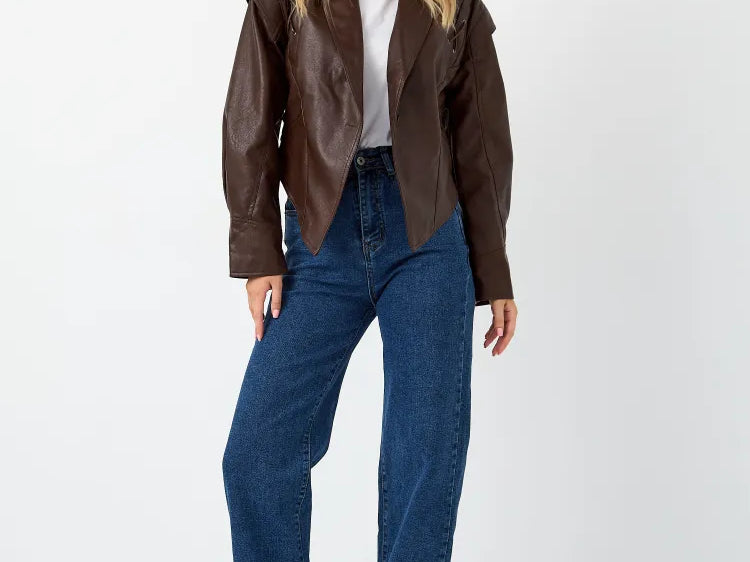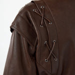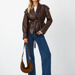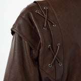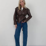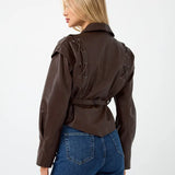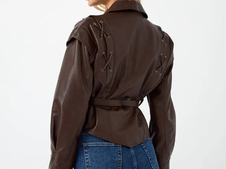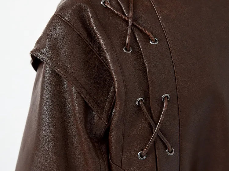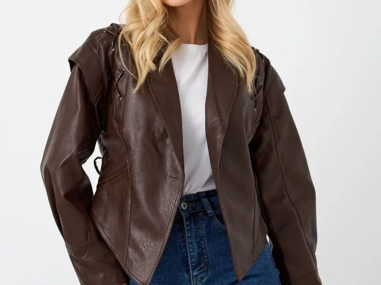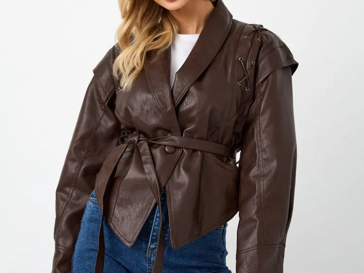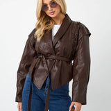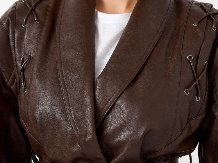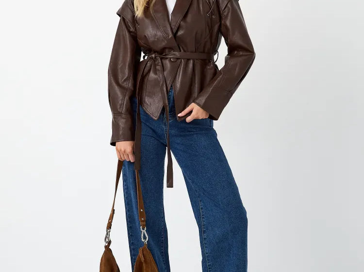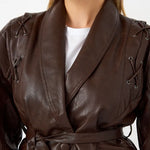 La veste en cuir vintage Jasmin dégage une élégance intemporelle avec une touche vintage. Cette veste en cuir marron présente une coupe décontractée et une ceinture à nouer pour accentuer la taille, créant une silhouette raffinée. Les détails à lacets sur les épaules et dans le dos ajoutent une touche ludique et unique. Confectionnée en simili cuir de haute qualité, la veste Jasmin allie look luxueux et durabilité.