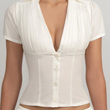 De Cecilia V-hals Top combineert structuur met elegantie. De diepe V-hals en subtiele plooien zorgen voor een flatterende, vrouwelijke pasvorm. Ontworpen met korte mouwen en een knoopsluiting aan de voorkant, is dit klassieke stuk moeiteloos te combineren met jeans voor een casual uitstraling of met een broek voor een verzorgde kantooroutfit.