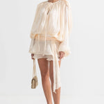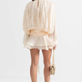 De Chiara Ruffled Mini Dress is de perfecte mix van elegantie en speelse charme. Met een ontwerp met lange mouwen, toont deze jurk delicate geplooide stofdetails die de vloeiende silhouet versterken. De gerimpelde manchetten en zoomlijn voegen een zachte, romantische toets toe, terwijl de bijpassende stoffen tailleband de taille accentueert voor een flatterende pasvorm.