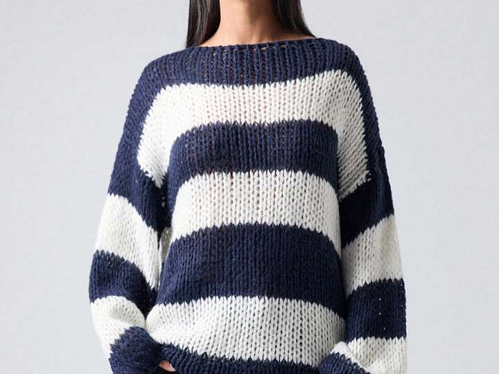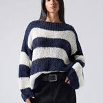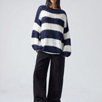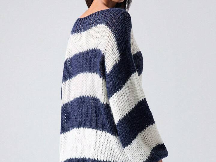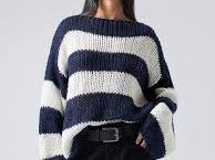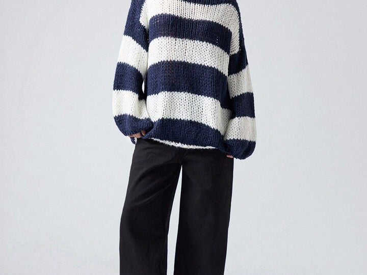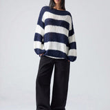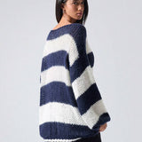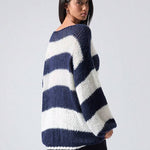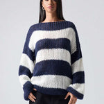 Experience the cozy and chic vibes of our Aubrey oversized striped cardigan! Keep warm and look effortlessly stylish with this timeless piece. Made with premium materials, this cardigan boasts thick blue and white stripes, adding a playful and dynamic touch to your wardrobe.