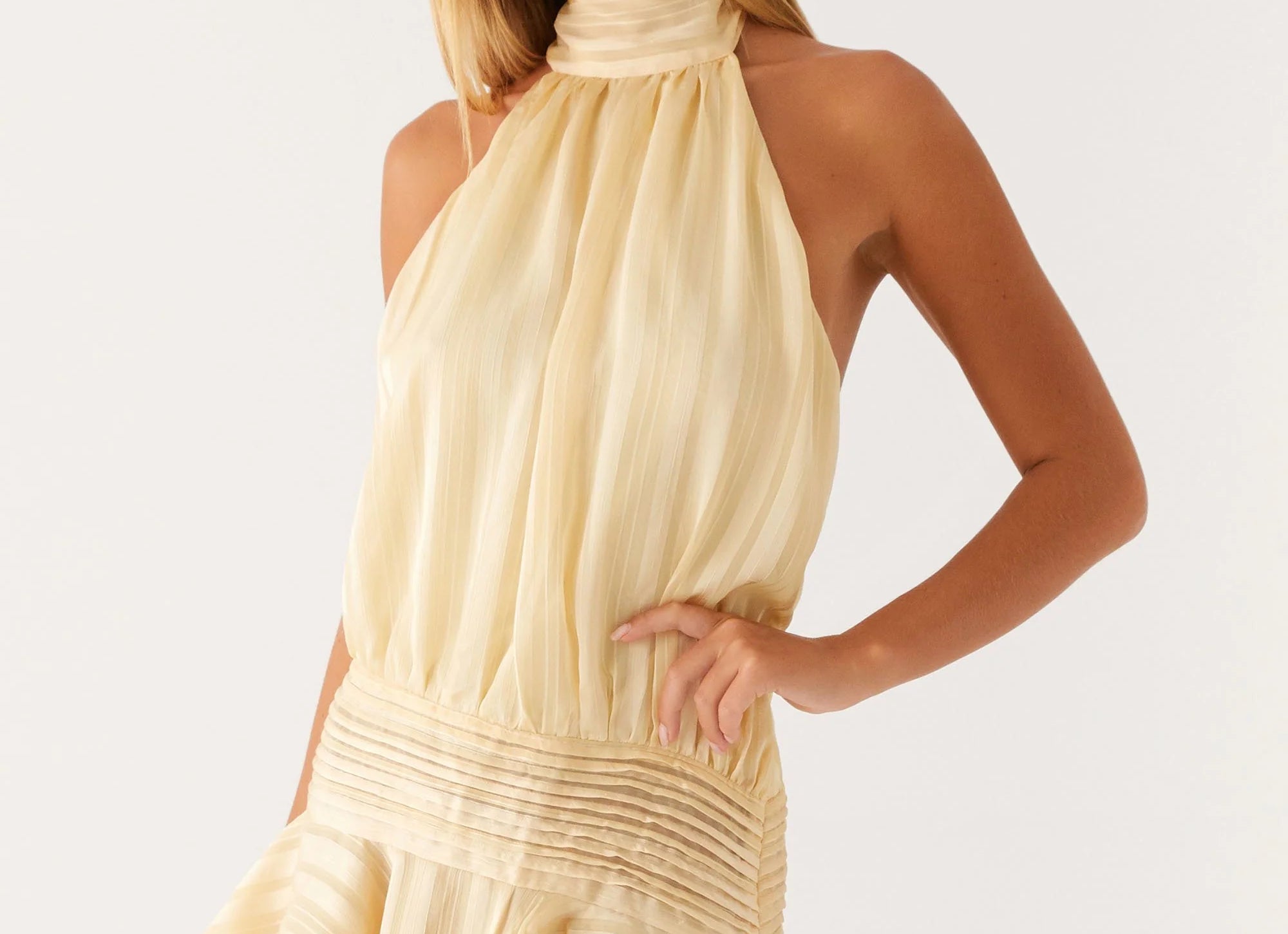The Bella Halter Pleated Mini Dress features a charming mini length and a flattering bias cut that falls gracefully. It is fully lined to provide comfort and a smooth fit, making it perfect for a gentle, feminine style that moves with ease.