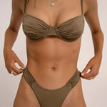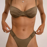 With its monochromatic color, the Coco bikini set is sure to turn heads. Keep it simple yet stylish with this minimalist two-piece bikini set! The push up swim top features detachable soft padding cups and ruched details at the front, with adjustable shoulder strings and a tie closure at the back for a customizable fit. The matching high leg bikini bottom has gathered charms at both sides and a cheeky coverage, making it the perfect choice for a day spent lounging by the pool or soaking up the sun at the beach.