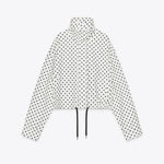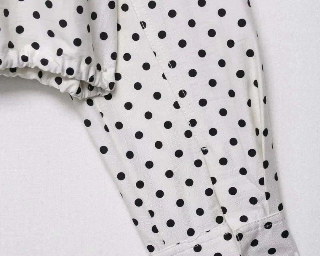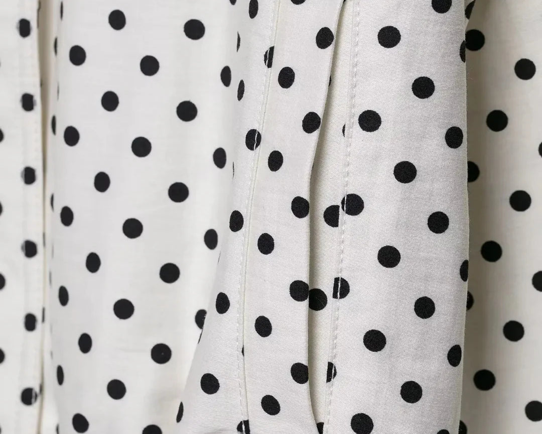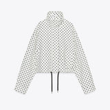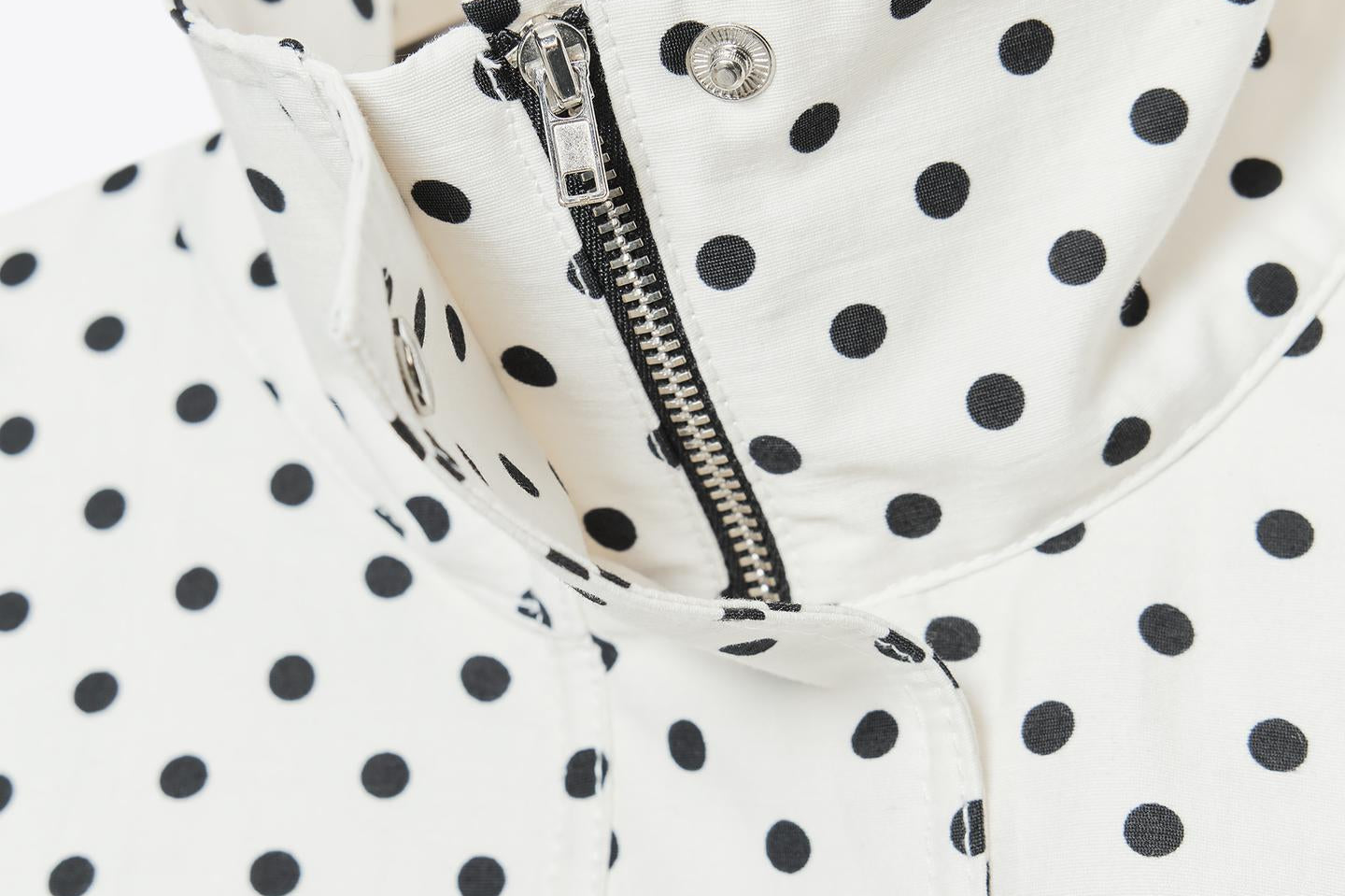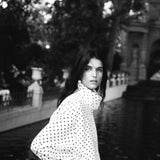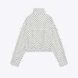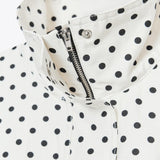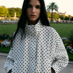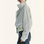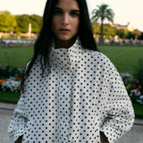 The Isla Polkadot Bomber Jacket offers a fun and sophisticated update to a classic design. Made from lightweight material, it delivers both style and comfort for daily wear. Its black polkadot print adds character, while the high collar and relaxed fit give it a modern feel. Ideal for layering in any season, this jacket effortlessly complements both casual and dressier outfits.