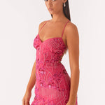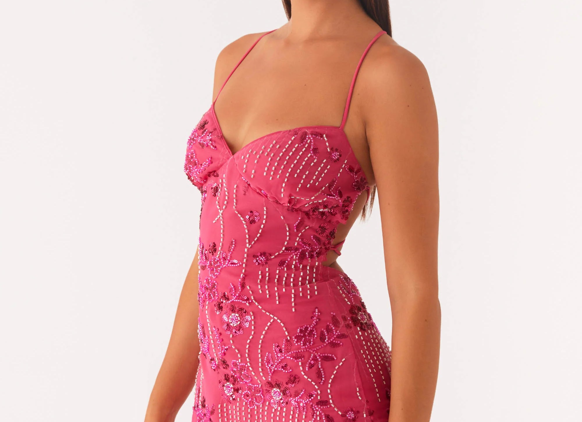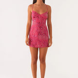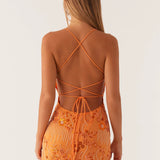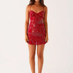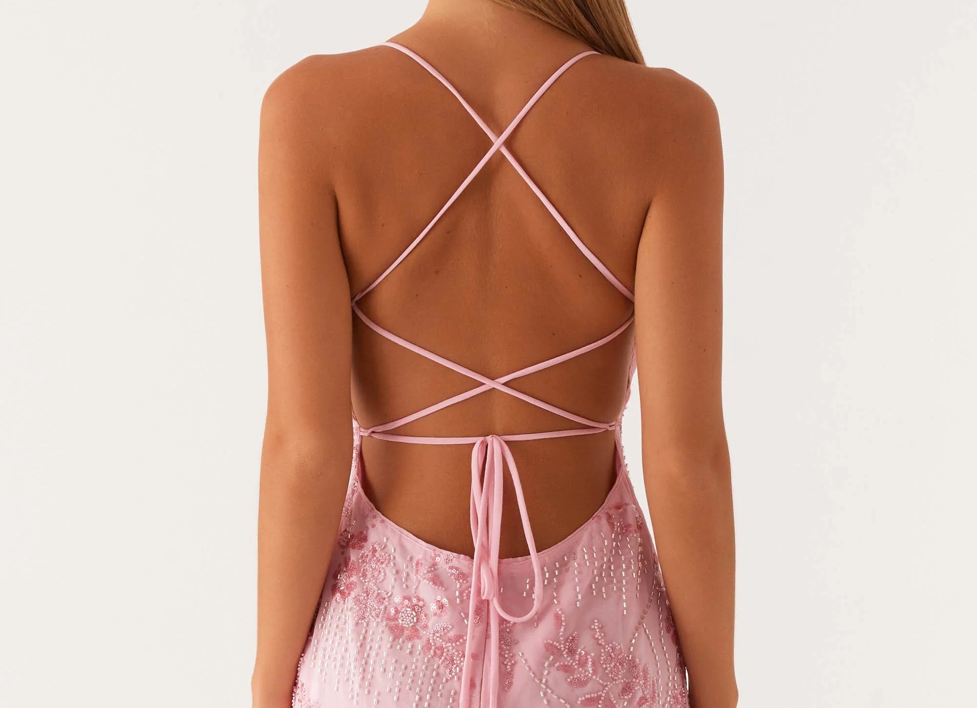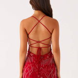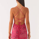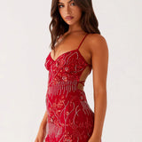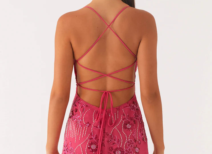 Make a bold statement with the Kaeli Backless Sequin Mini Dress, a show-stopping piece designed to dazzle. Featuring intricate sequin floral embroidery and a figure-hugging silhouette, this dress is made for unforgettable nights out. The open back with criss-cross tie detailing adds a sultry touch, while the adjustable straps ensure the perfect fit. Style it with heels and simple accessories to let the dress shine.