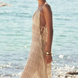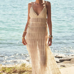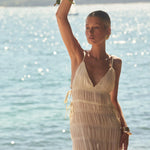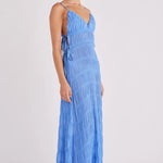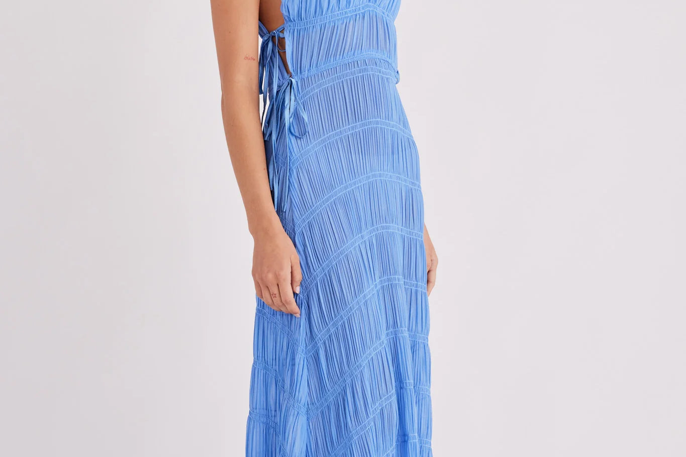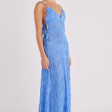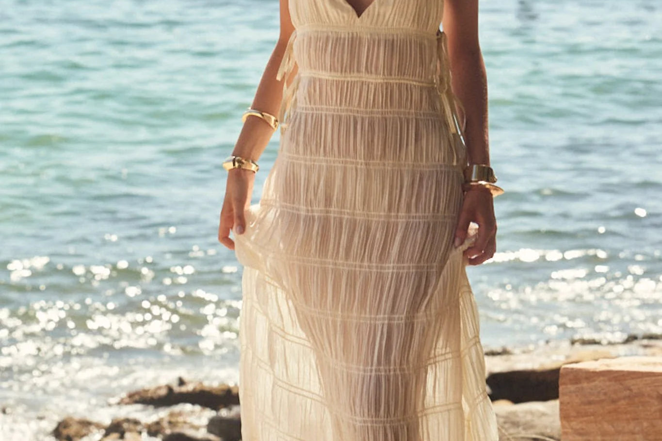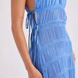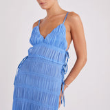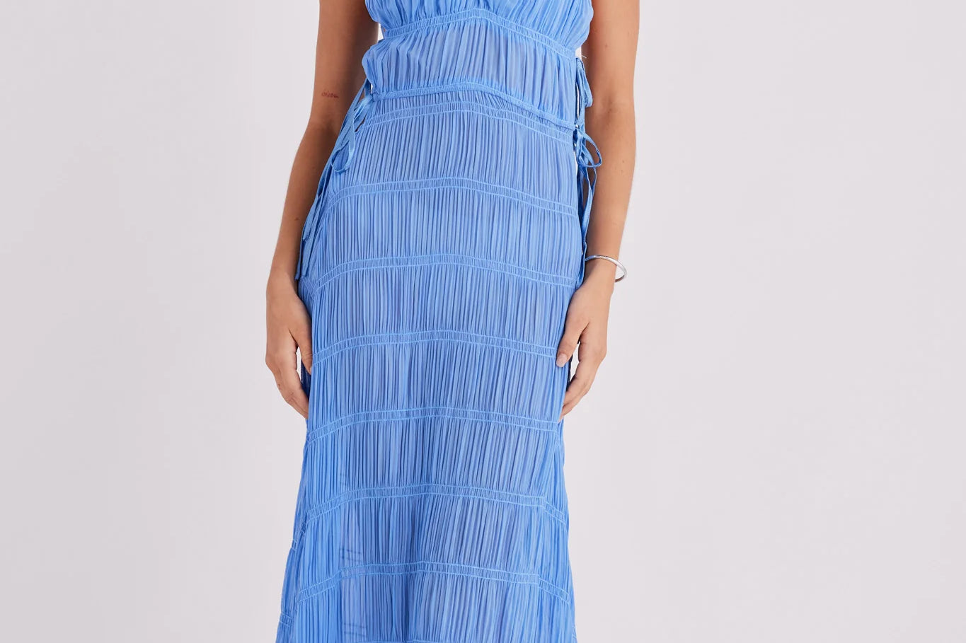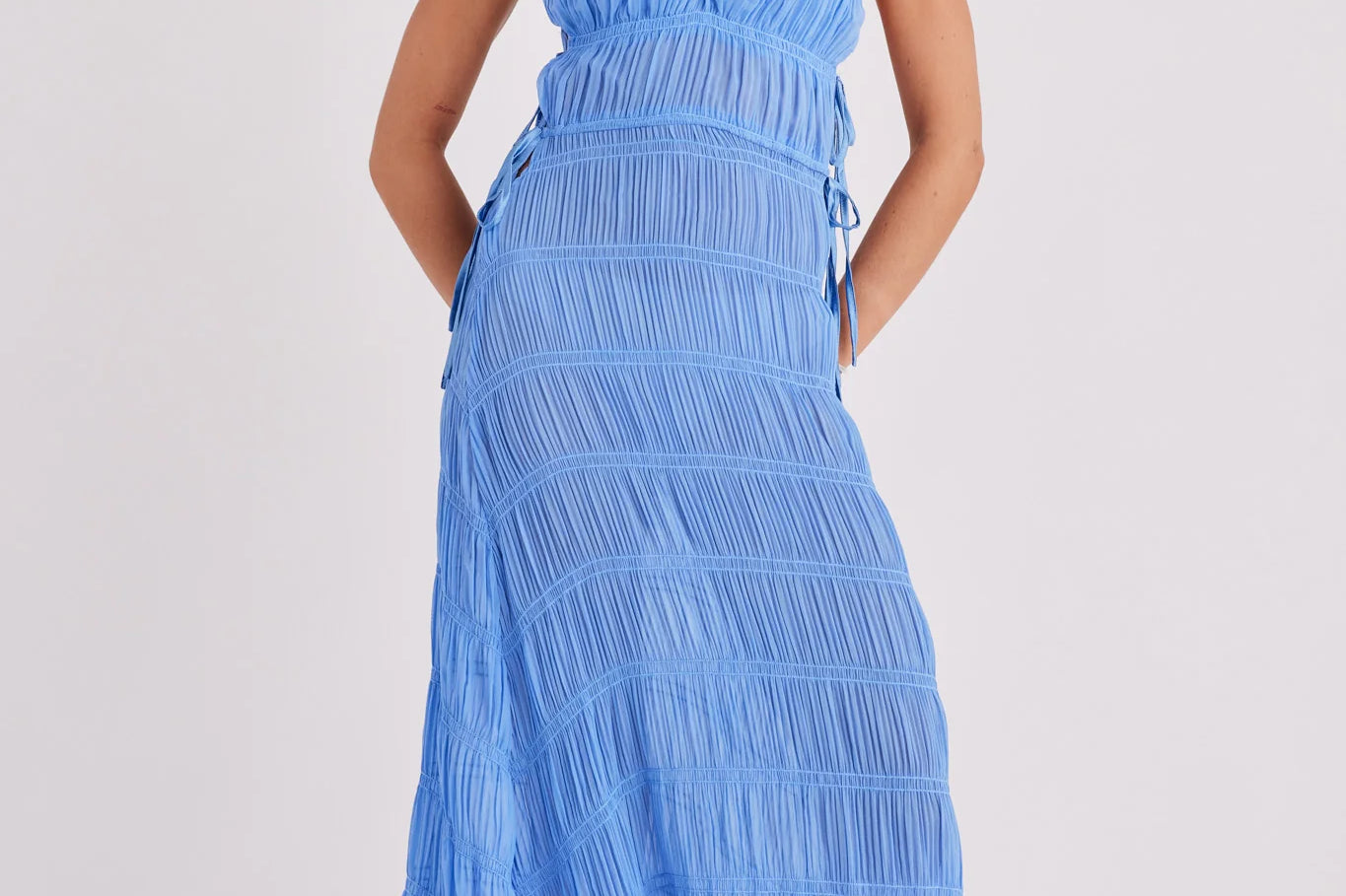 Elevate your wardrobe with the Kali Ruffled Maxi Dress, crafted from sheer crepe georgette for a light, flowing silhouette. Elegant ruching details enhance its voluminous shape, while a drawstring waistline allows for a flattering, adjustable fit. The dress features a daring low side cutout with drawstring channels, adding a subtle hint of allure. Perfect for both day and evening occasions, this maxi dress combines effortless elegance with contemporary design.