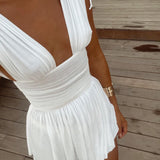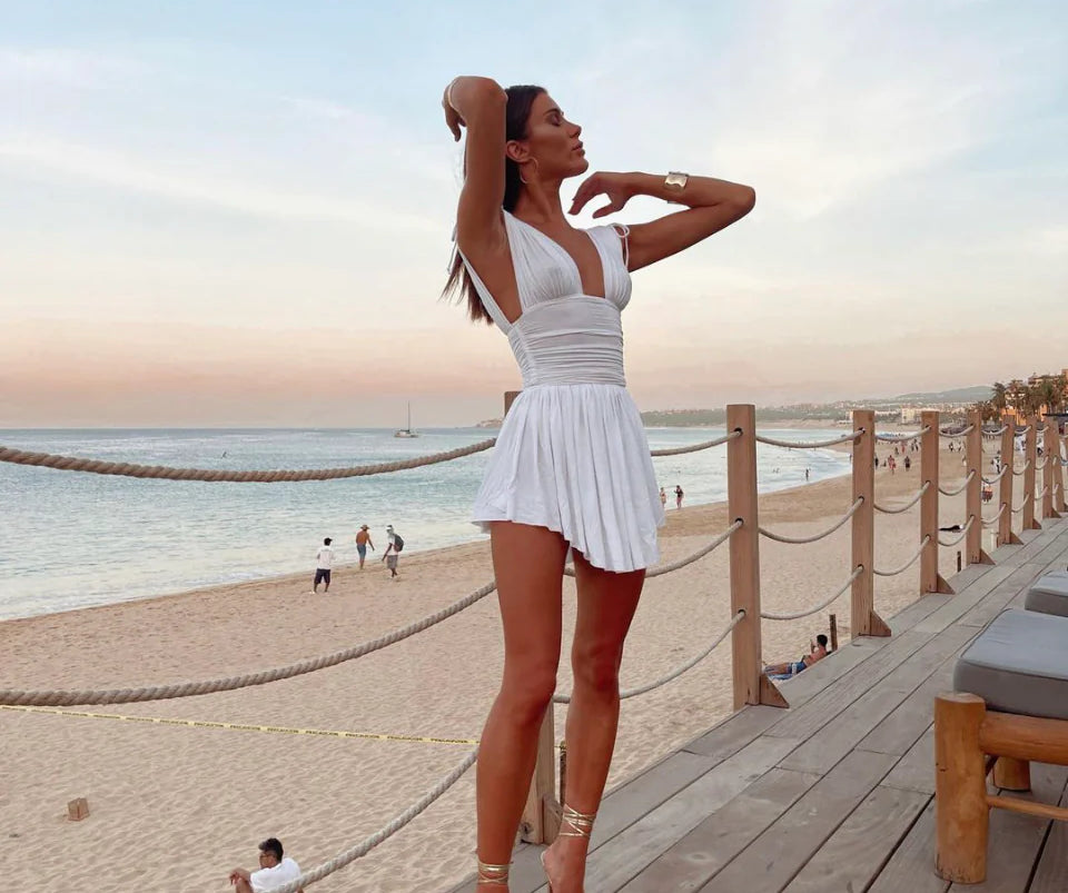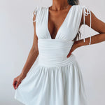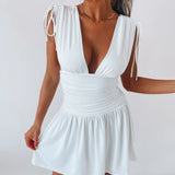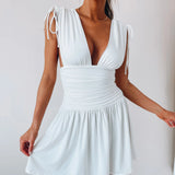 Our Louisa mini dress is sleeveless with string tie closures to synch them tighter or a more loose fit. The waist on this dress has synched sided for help shape the waist. The bust and waist are lined.