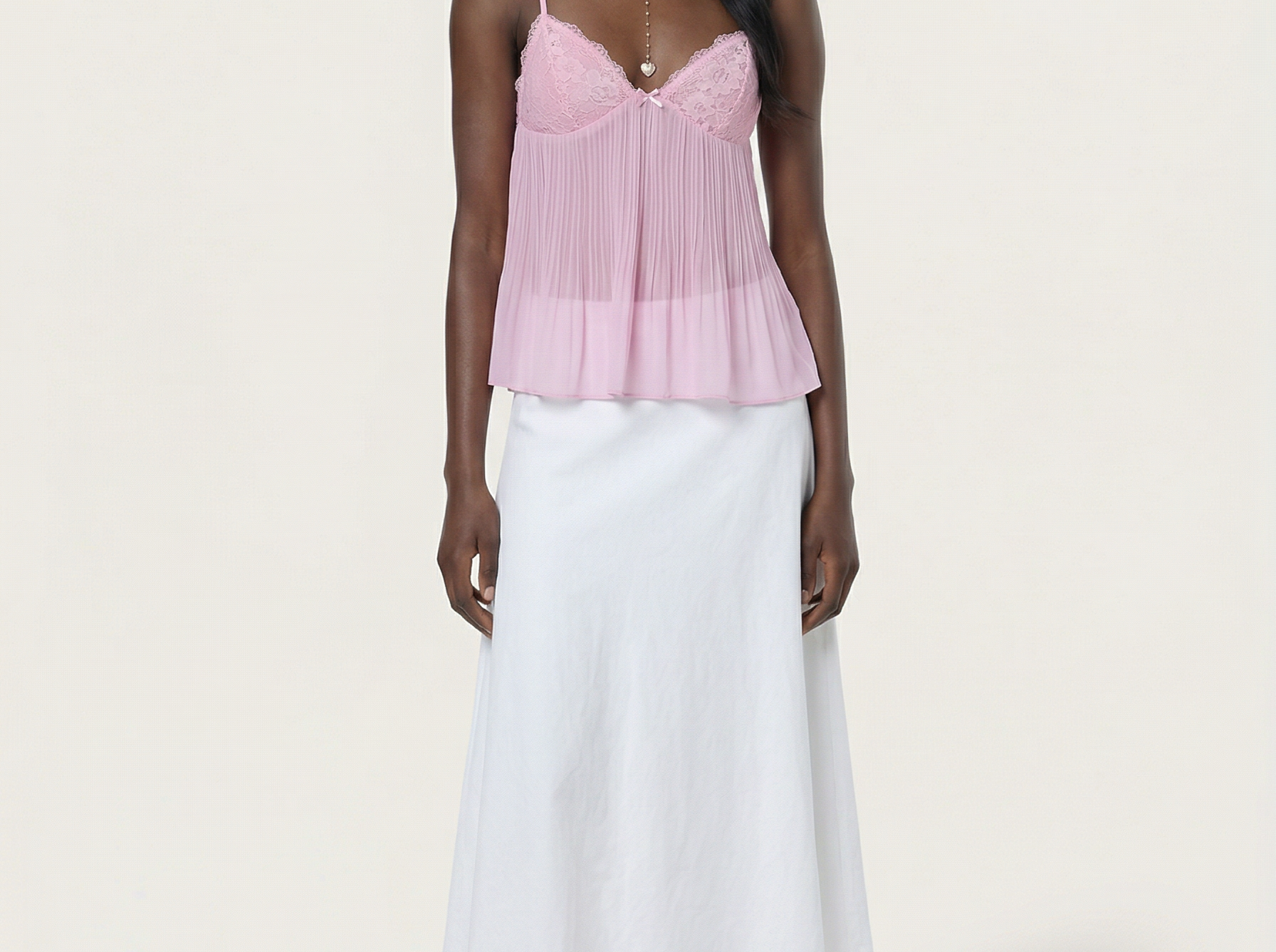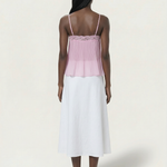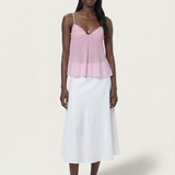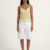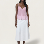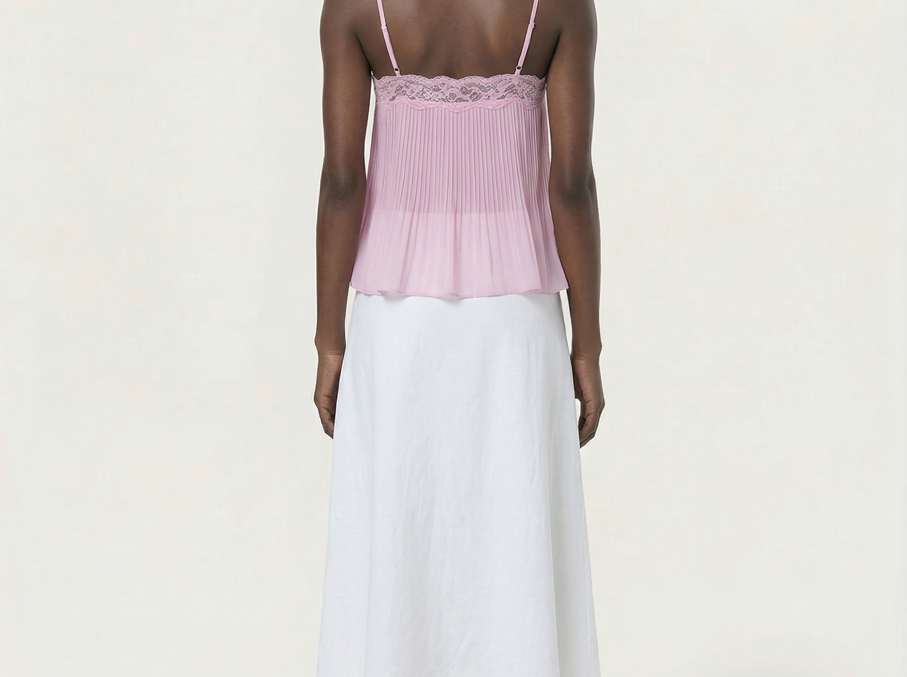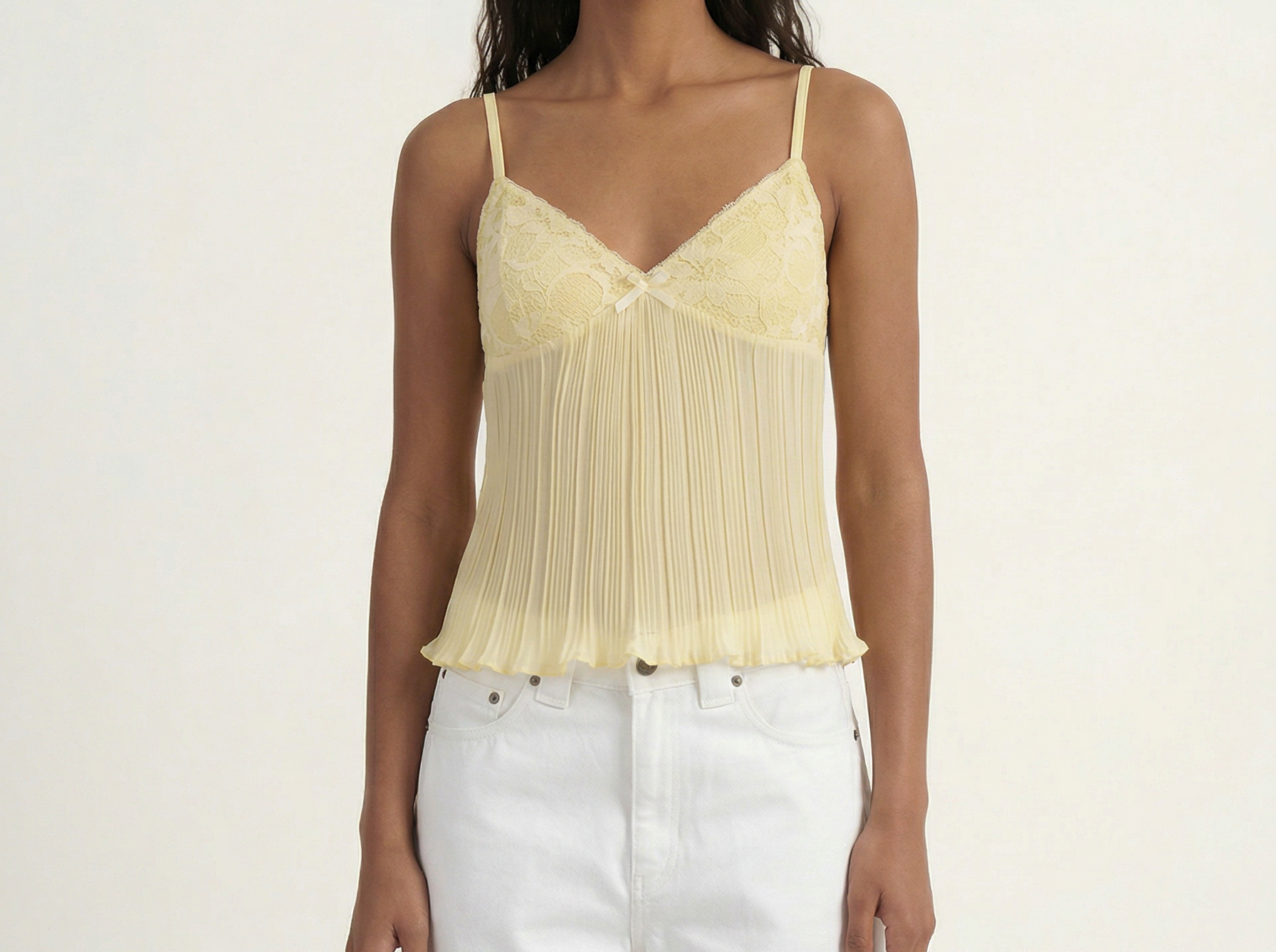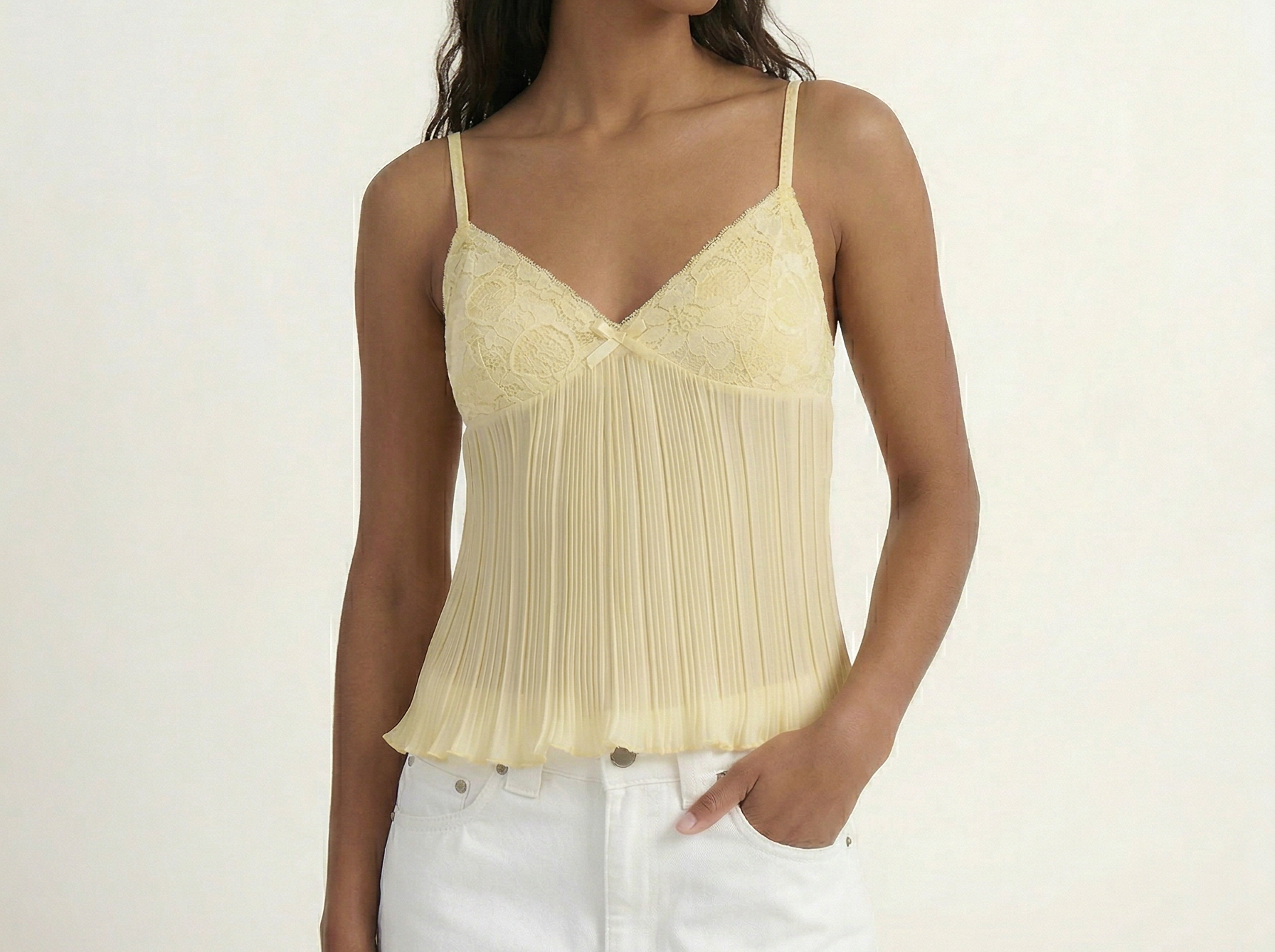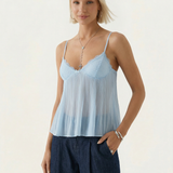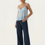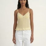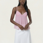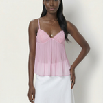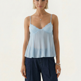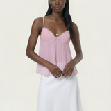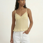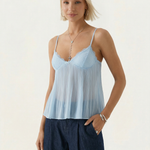 The Tatum Pleated Top brings effortless charm with its soft pleated fabric and delicate lace details. Featuring adjustable spaghetti straps and a flattering, flowy silhouette, this top adds a romantic touch to any look. The lightweight, semi-sheer fabric gives it a dreamy feel, perfect for warm days or layering. Style it with denim for a casual vibe or dress it up with tailored trousers for an elevated look.